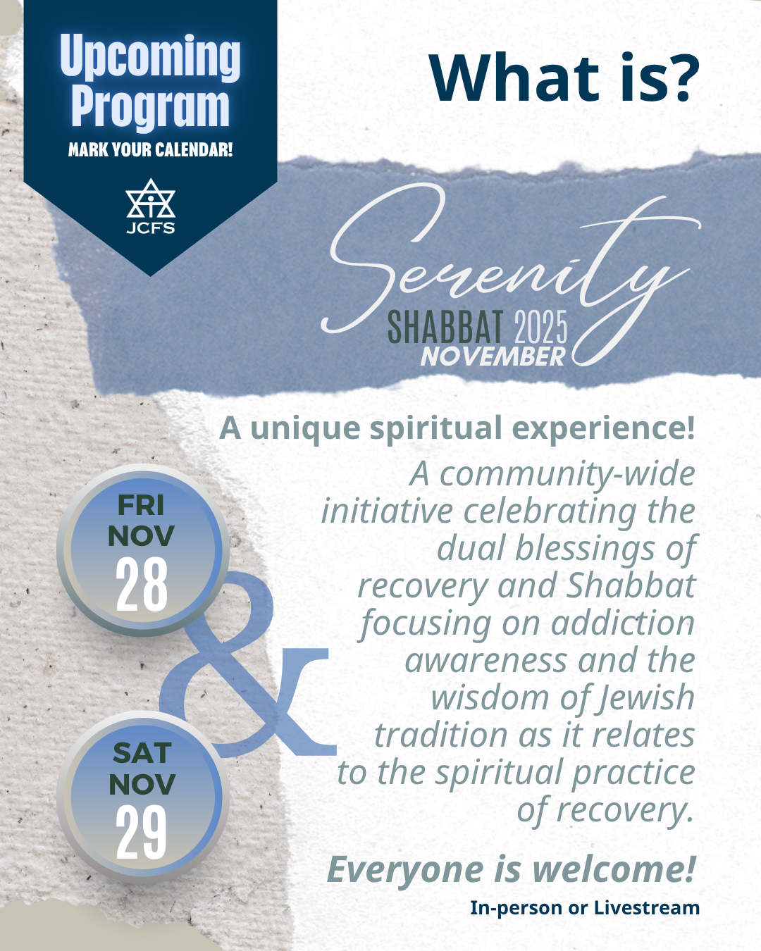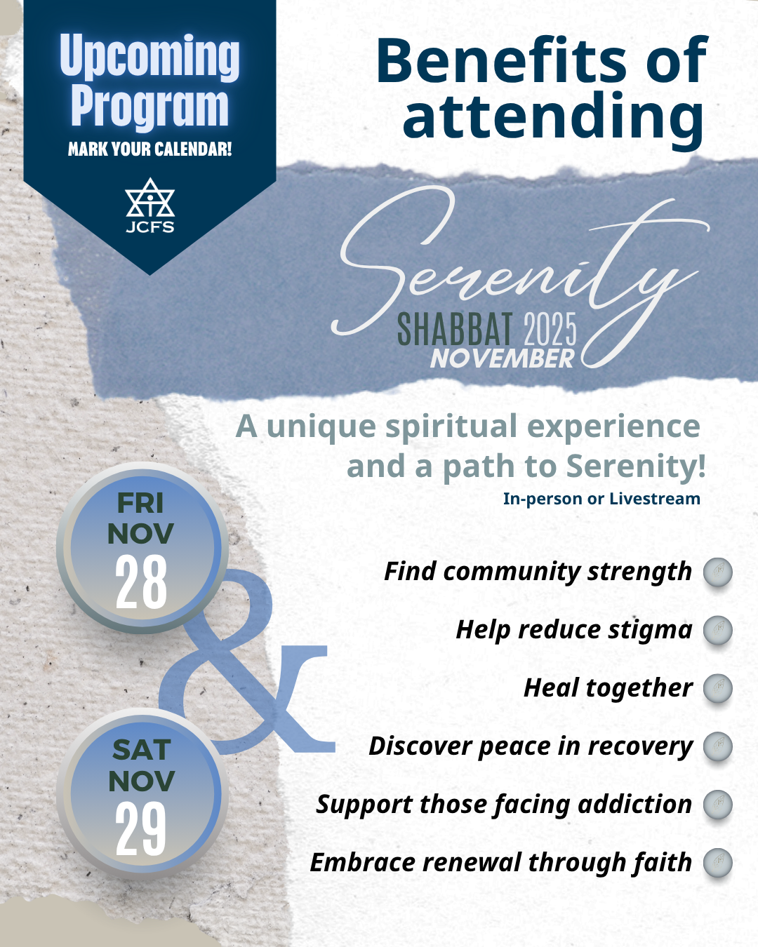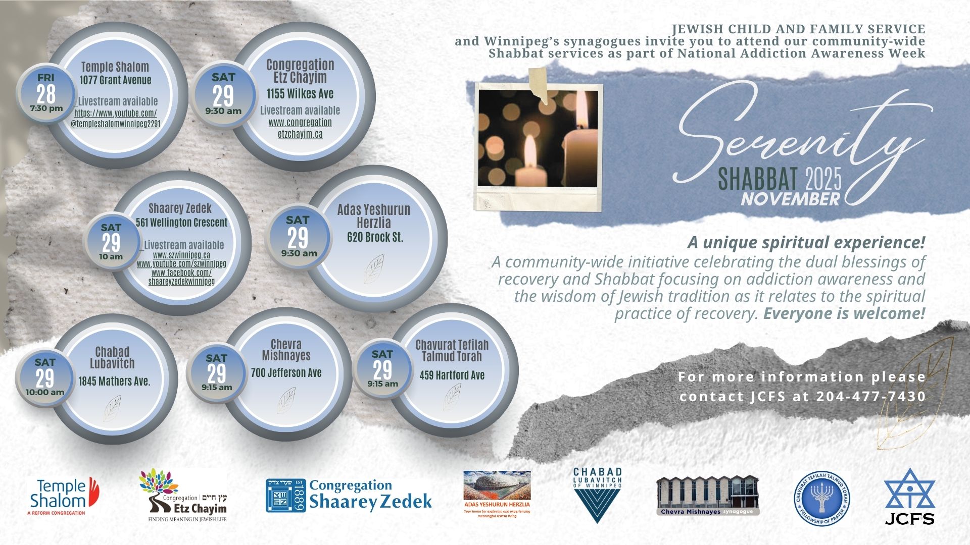 All participating synagogues offer in-person services for our Serenity Shabbat Program and everyone is encouraged to attend. For those who are not able to participate in person, livestream options may be offered online.