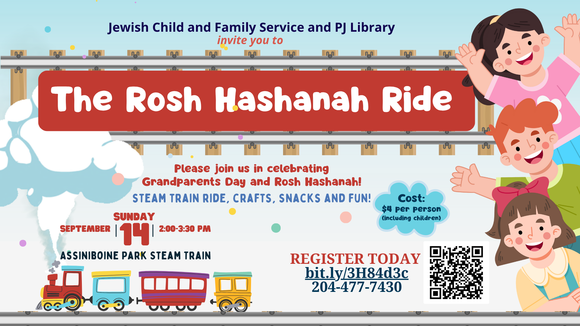 JCFS and PJ Library are partnerling on this intergenerational program to celebrate Grandparents Day and prepare for Rosh Hashana. Participants will meet at the Steam Train in Assiniboine Park and take a ride around the park. We’ll also do a storybook walk in that area. We will then proceed to a nearby picnic area where we’ll do crafts and have refreshments. We look forward to seeing you there!